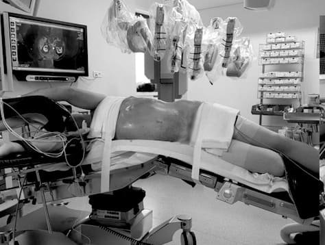 La colonne de coelioscopie et l’écran principal sont placés en tête du patient. Les check-lists salle et robot sont réalisées de manière systématique avant le début de l’intervention.
